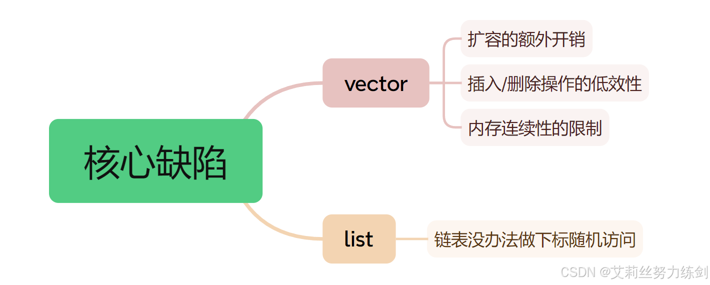 vector要求内存连续分配,这在内存碎片较多的环境中,可能会出现“明明总内存足够,但无法分配到连续的大块内存”的情况,导致扩容失败;而链表(list)的节点是分散存储、随机分布的,不受此限制。这也是vector的缺陷。