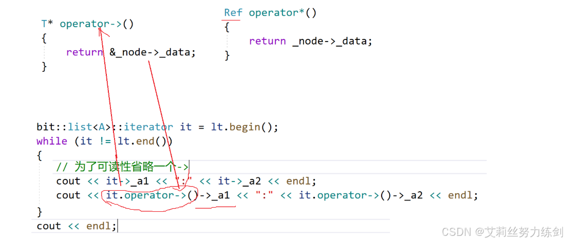 cout << it.operator->()->_a1 << ":" << it.operator->()->_a2 << endl; // 两个箭头
