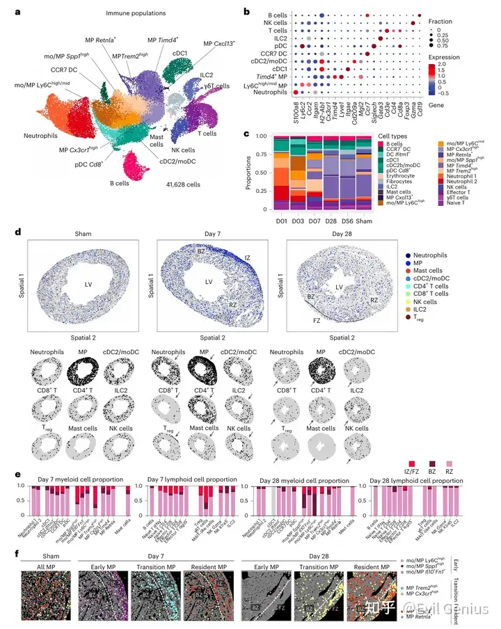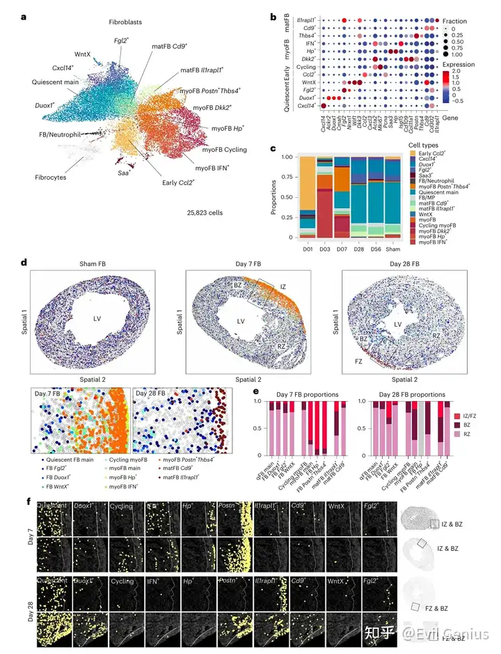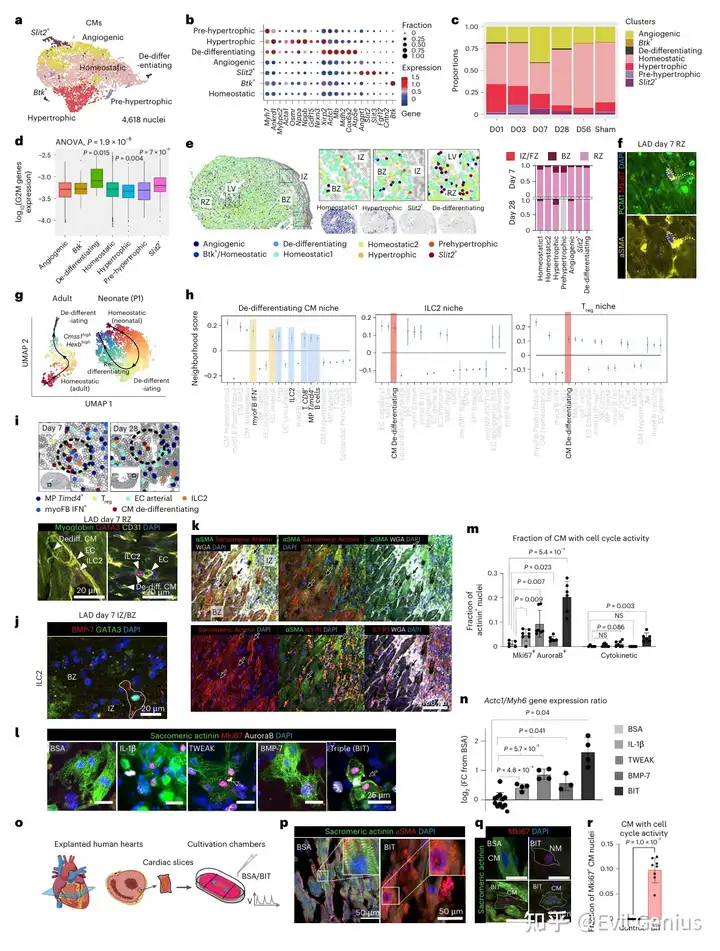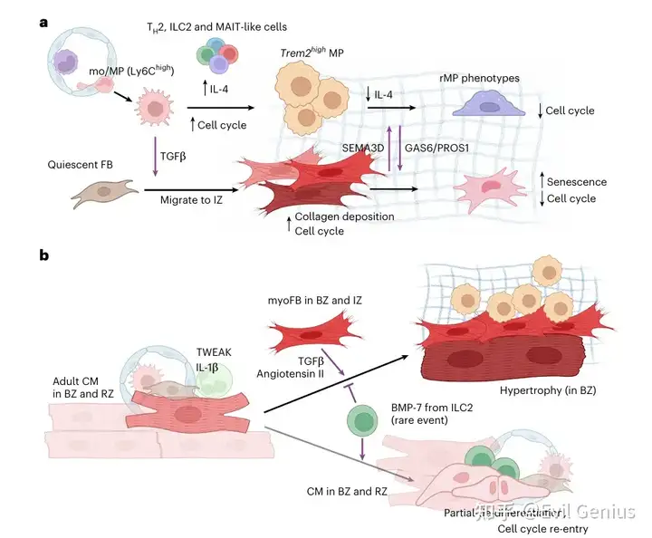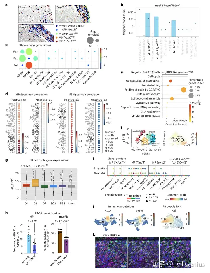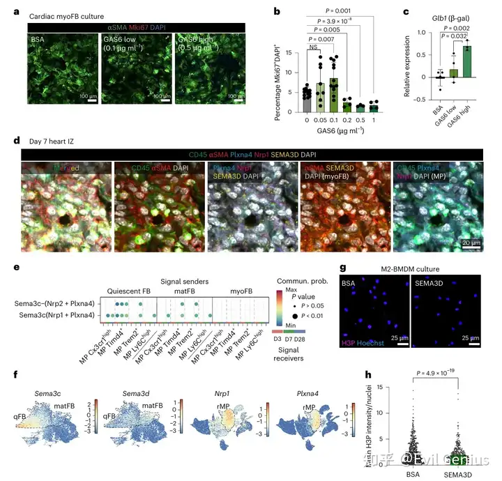 最后,探究这种肌成纤维细胞-巨噬细胞相互抑制机制是否在人类心脏中保守存在。重新分析了一个近期的人类心肌梗死snRNA-seq数据集,并聚焦于缺血区细胞,其中包含大量具有高细胞周期基因表达的肌成纤维细胞(PDGFRA⁺ACTA2⁺COL1A1ʰⁱᵍʰ)。髓系群体主要包括PTPRC⁺ITGAM⁺ 巨噬细胞,包含浸润的CCL18⁺ 和定居的LYVE1⁺ 表型。与小鼠中的观察相似,GAS6 表达在定居型 versus 循环型巨噬细胞中富集,而 AXL 在所有成纤维细胞中均有表达。用不同浓度的重组人GAS6配体处理原代人心脏TGFβ激活的肌成纤维细胞,通过免疫荧光Mki67⁺ 细胞核定量和Mki67表达qRT-PCR检测,导致了与小鼠心脏肌成纤维细胞相似的增殖变化趋势。综上所述,研究结果表明GAS6对心脏成纤维细胞增殖的调控是保守的。