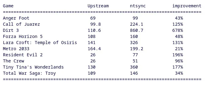 根据该文章的评测数据,NTSync 在初步测试中表现出色,能让部分 Windows 游戏在 Linux 下的运行性能显著提升。下图展示了其中的对比结果:
