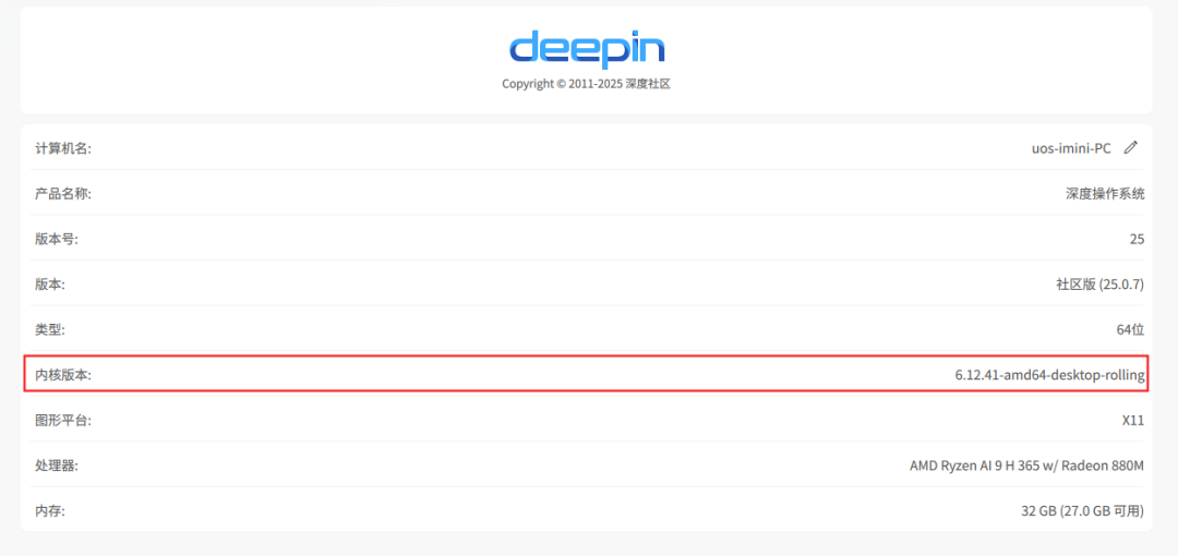 首先进入 控制中心 → 系统 → 关于本机,查看当前内核版本: