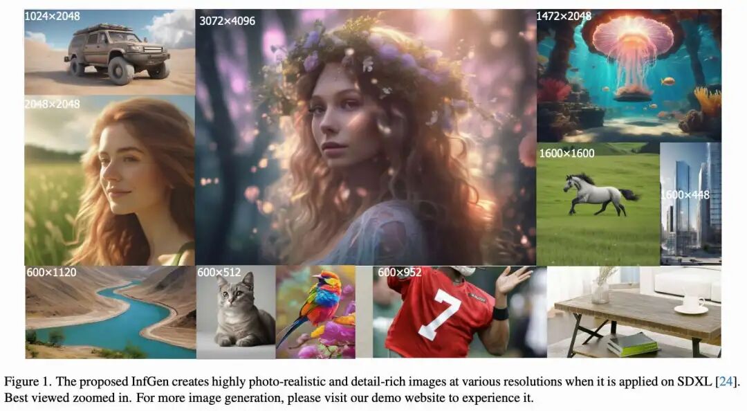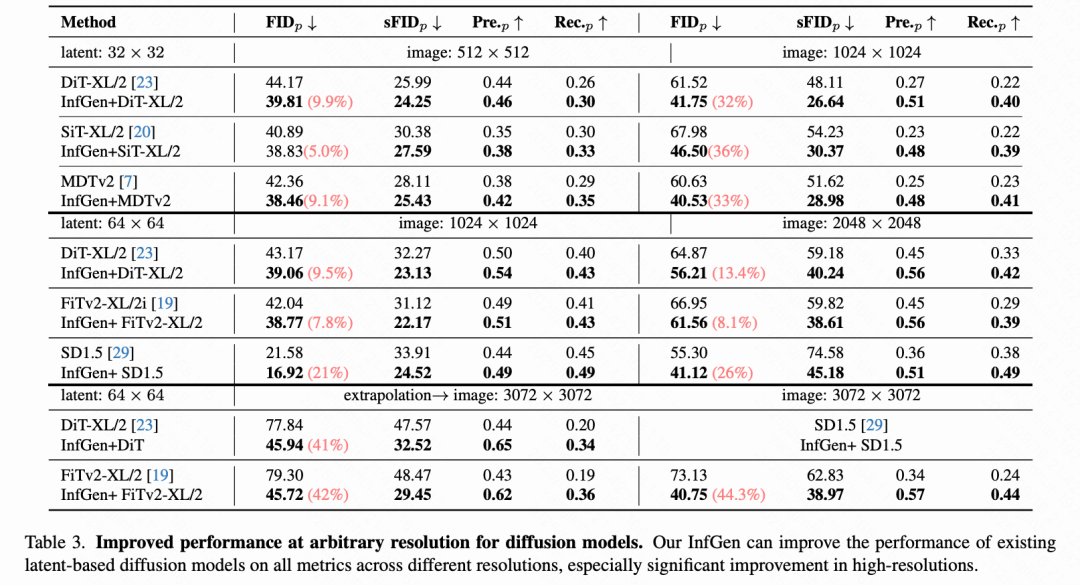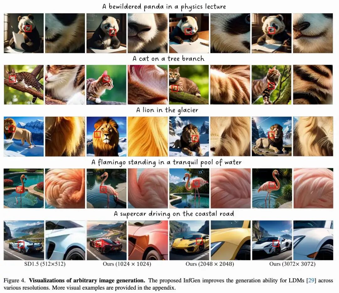 InfGen提供了一个高效的框架,用于生成任意分辨率的图像,解决了现有方法在扩散模型中生成任意分辨率隐空间时,常常导致显著延迟和计算开销的问题。通过在紧凑的隐空间中训练一个次级生成模型,InfGen 可以将低分辨率隐空间解码为任意分辨率的图像,而无需改变现有扩散模型的结构或训练。实验表明,InfGen 作为一种现成的增强工具,可以改善扩散模型在任意分辨率下的表现。与其他专门方法相比,InfGen 在质量上更优,并显著减少了推理时间,生成一个 4K 图像仅需 7.4 秒。这一进步突显了 InfGen 在显著提升快速超高分辨率图像生成能力方面的潜力。