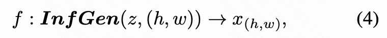 训练pipeline。 在训练阶段,高分辨率图像最初经过裁剪和调整大小操作以符合固定尺寸,例如512 × 512。这些预处理图像随后由VAE编码器编码为固定大小的隐空间变量 ,通常缩小8倍,得到像4 × 64 × 64的尺寸。InfGen模型旨在实现任意分辨率生成。映射定义为: