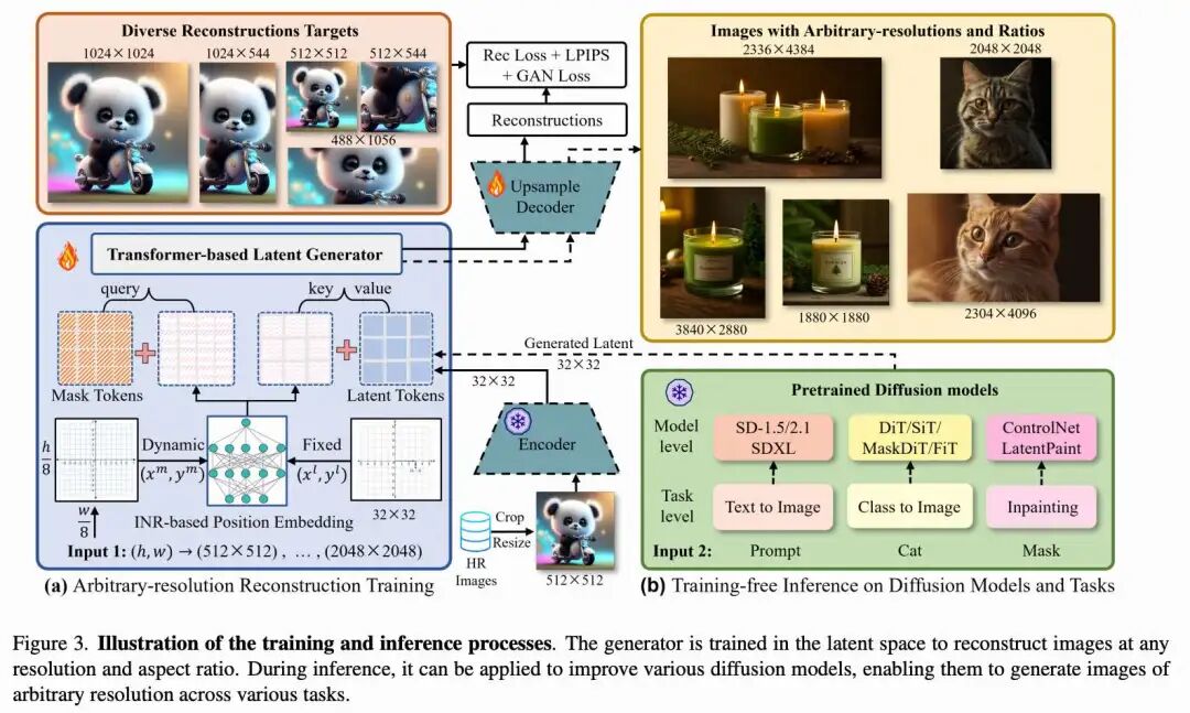 概述。 使用 -预测范式的扩散模型通常在隐空间中操作。生成任意分辨率的图像涉及处理不同形状的隐空间变量,导致超高分辨率生成的高计算成本和延迟。本文提出了一种用于任意分辨率生成的更快速的扩散模型方法。首先将任意分辨率生成重新定义为一个两阶段任务。在不修改扩散模型的情况下,用一个能够解码任意分辨率的生成器替换了VAE解码器。然后详细介绍了这种生成器的设计和训练。由于训练高分辨率解码器计算成本高,最后引入了一种用于超高分辨率生成的迭代外推方案,提供了一种无需训练的分辨率增强方法。
