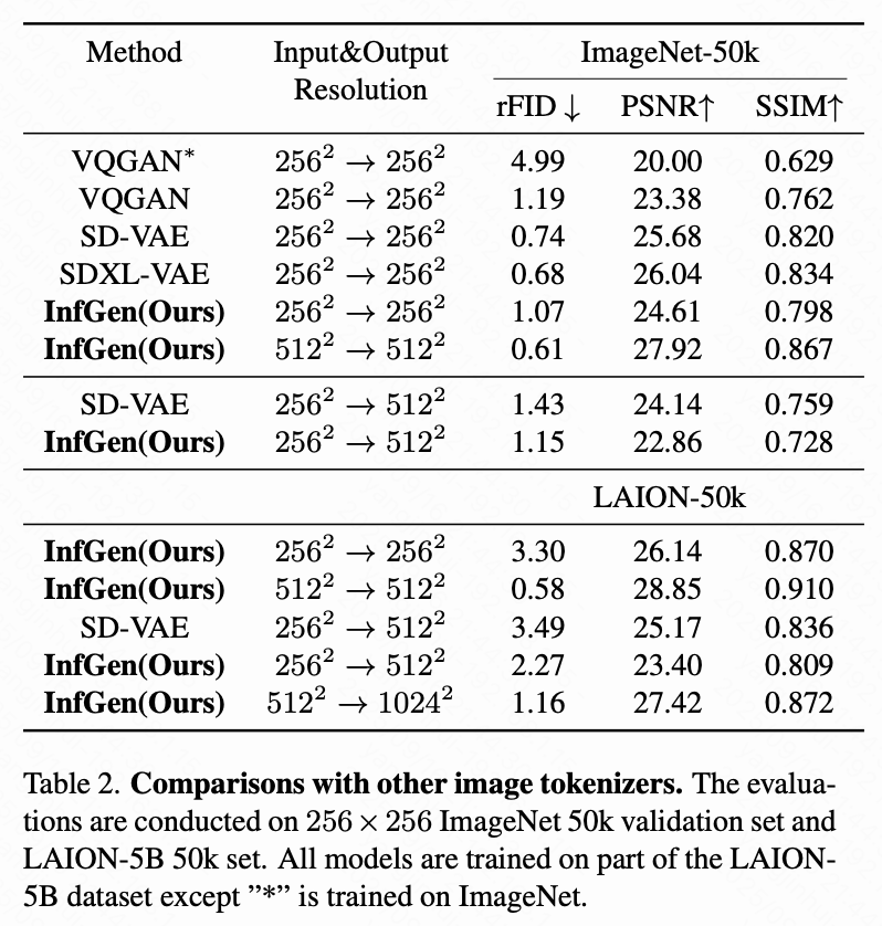 将本文的tokenizers与离散图像tokenizers(如 VQGAN)和连续图像tokenizers(如 SD VAE 和 SDXL VAE)进行比较。如下表 2 所示,尽管 InfGen 被训练在更复杂的任务上,我们的tokenizers在重建性能上与常用的 VAE 相比具有竞争力。此外,在不同的输入输出分辨率上测试了 LAION 数据集,以评估图像重建质量。LAION 图像呈现更复杂的场景,我们的结果与 ImageNet 验证集的结果一致,表明我们的tokenizers有效处理了以对象为中心和以场景为中心的图像。