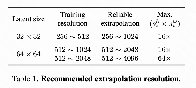 下表 3 的结果验证了这是一种稳健的外推方法,用于灵活的分辨率增强,确保高质量的图像生成。