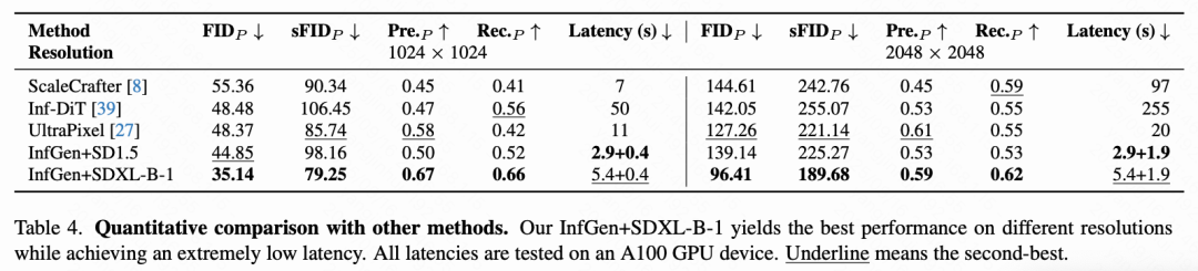 定量比较。 正如下表 4 所示,本文方法 InfGen+SD1.5 在两个高分辨率下的 FID、sFID、Precision 和 Recall 方面表现出竞争力。值得注意的是,InfGen 在推理效率上具有显著优势,生成一个 的图像大约只需 5 秒,比 UltraPixel 快 4 倍。无训练方法和基于超分辨率的方法生成一个 2K 图像需要几分钟。这些发现强调了我们的方法在生成超高分辨率图像时的卓越效率。
