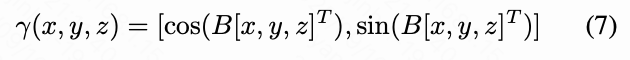 傅里叶变换和神经映射。 三维坐标被转换为高频傅里叶特征,以增强模型的模式捕捉能力: