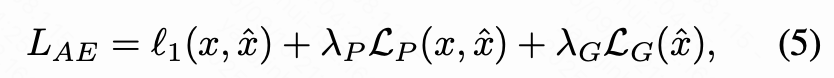 其中, 表示重建与真实值之间的 L1 损失, 是通过 LPIPS 测量的感知损失, 是从 PatchGAN 判别器 导出的对抗损失。