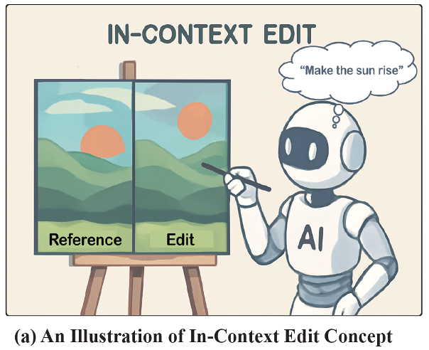作者探索了一种类似双联图形式的编辑框架(称之为上下文编辑框架),我们可以把编辑模型想象成一个AI画家,而他需要根据一张放在左边的参考图,在右侧空白区域中照猫画虎绘制非编辑区域(如示意图中的山脉、天空),同时根据指令把需要编辑的区域也绘制完成(升起的太阳)。这种架构所带来的优势是,参考图和待编辑图处于同一个上下文中,即他们的token是拼接的。对于待编辑图像来说,它对参考图的注意力更强,非编辑区域保持更强;此外这种架构无需改变模型原有结构,不需要额外增加模块编码参考图像,只需将两个图像拼接起来即可(等价于token维度进行拼接)。