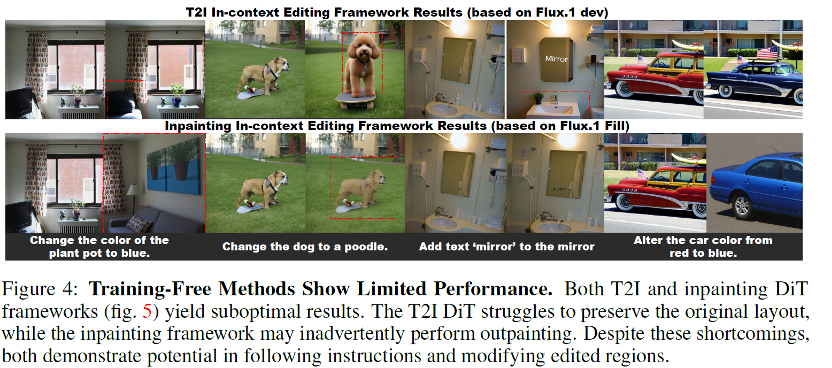 因此作者采用In-Context Edit prompt作为模型的指令输入形式。同时作者基于文生图DiT和Inpainting DiT尝试了两种免训练的架构来让DiT模型能够既接收参考图,又根据上下文编辑指令完成图像编辑:
