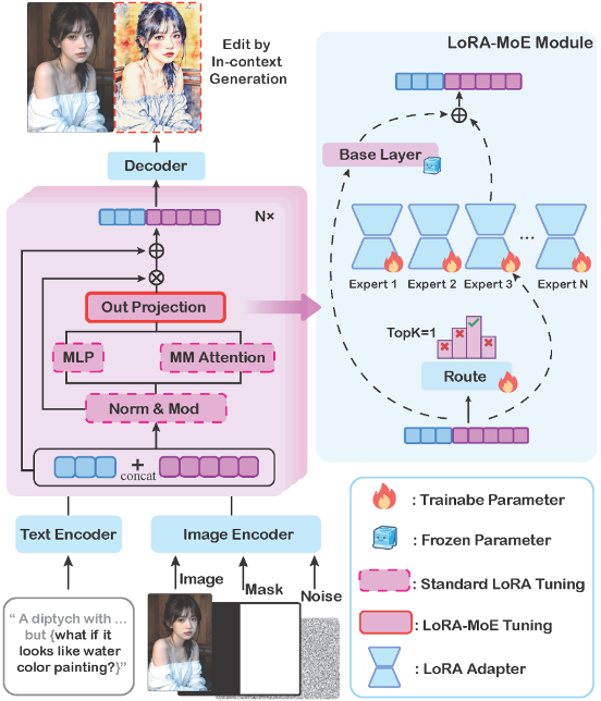 然而作者发现仅仅使用普通的lora在不同的编辑任务上成功率依然不够高,并且有些任务如Remove、style等编辑效果较差。作者认为这是由于不同的编辑任务需要不同的特征处理模式,而仅靠一个LoRA难以学习所有编辑类型的处理方法,因此采用多LoRA专家的混合训练或许是提高编辑效果的关键。于是作者借鉴了LLM领域发挥重要作用的MoE(混合专家模型)方法,将其用在DiT多模态大模型中,并将LoRA设置为不同的专家进行训练,得到了最终的模型。尽管采用了MoE+LoRA的形式,模型的训练参数依然远远少于SOTA模型(0.2B vs 17B)。