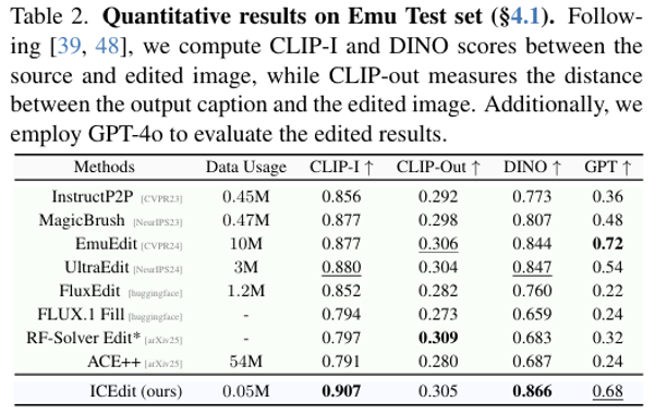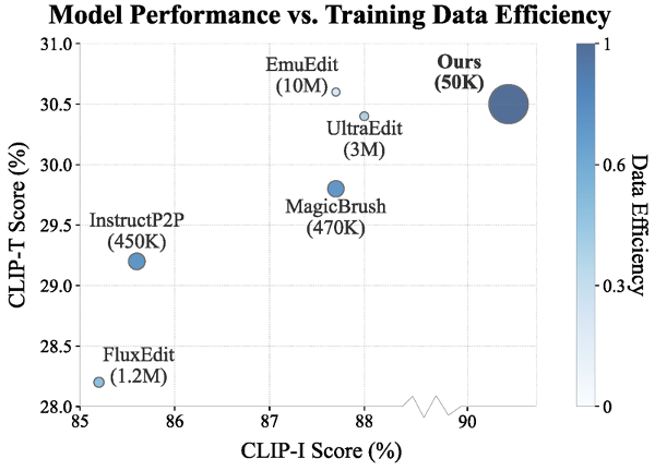 图注:该图展示ICEdit使用数据量以及编辑性能与其他SOTA模型对比;ICEdit仅用50k数据训练就达到了和10M训练的EmuEdit类似的性能。