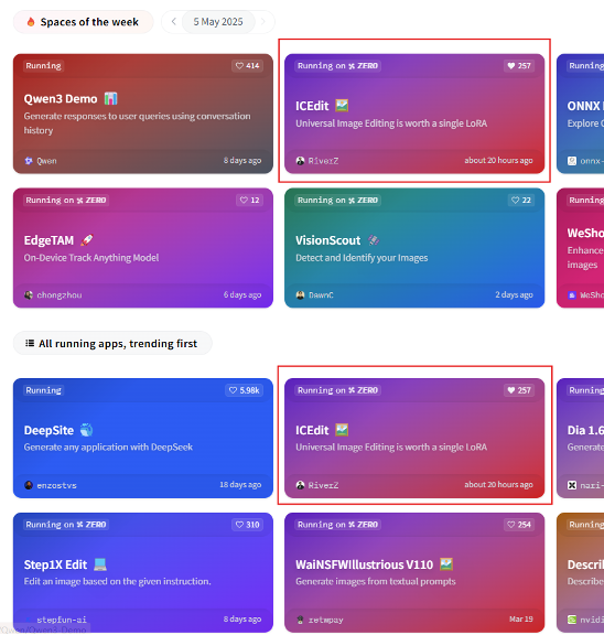 在五一假期期间,Hugging Face上出现了一款爆火的图像编辑模型,号称用一个LoRA就可以实现像GPT-4o一样的图像编辑功能。该项目不仅冲上了Hugging Face周榜第二名,仅次于Qwen3;还在外网社交媒体上火出圈,用户纷纷秀出使用体验~,之前AI生成未来也和大家分享过: