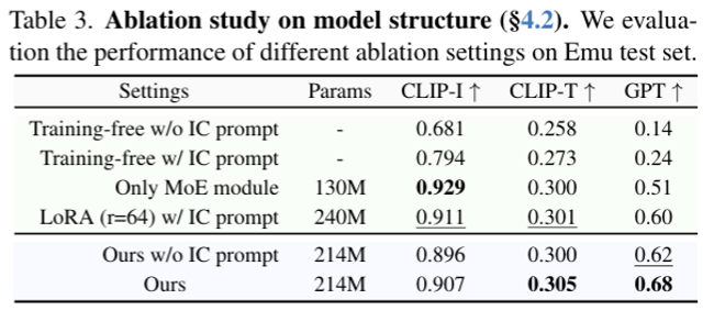 表3 使用LoRA微调后相比training free性能显著提升,采用MoE架构后性能继续上升