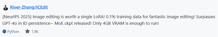 而就在最近,该工作已被NeurIPS 2025正式接收!这个模型就是由浙大和哈佛团队提出的一种新型图像编辑方法ICEdit,仅需要以往模型0.1%的训练数据(50k)以及1%的训练参数量(200M),就实现了多种类型高质量图像编辑结果。