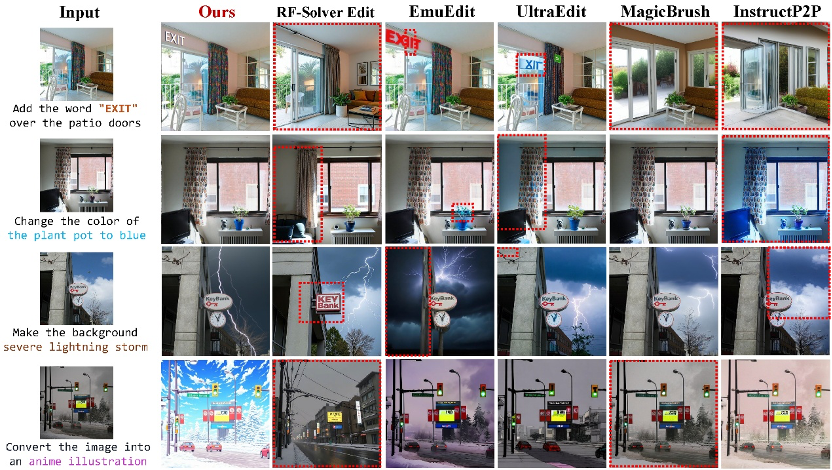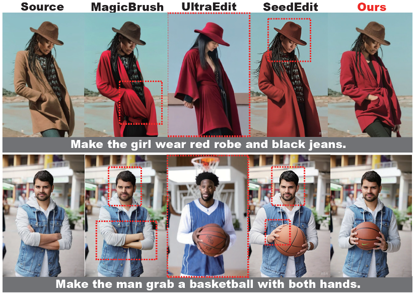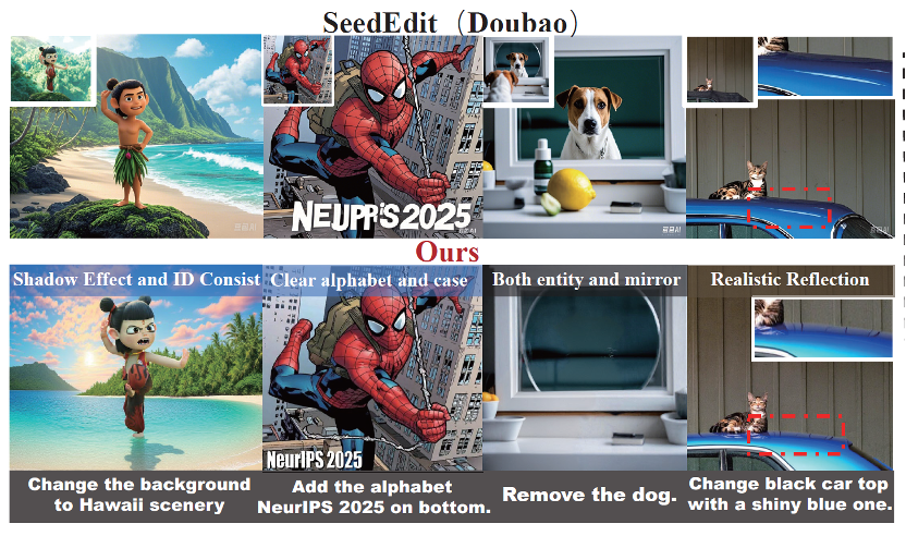 此外,将该方法与GPT4o等一众商业大模型做对比,尽管在语义理解、编辑多样性上相比还有差距,但该模型展现出了极强的人物ID保持、非编辑区域保持以及指令遵循能力,甚至一定程度上超越GPT4o、Gemini等商业大模型。此外,该模型与商用模型相比更开源、低成本、速度也更快(8~10s即可完成一张图片的编辑),不可谓不强大。