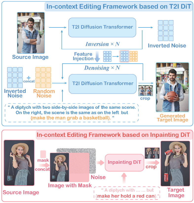 第一种框架是基于文生图DiT模型,该框架流程略微繁琐一些,简单来说就是将待编辑图像先进行图像反演(inversion),并保留反演过程中模型内部的图像特征,用于后续注入(与RF-Solver-Edit类似)。而完成图像反演后获得的噪声图像,会与一个相同尺寸的随机初始化噪声拼接,形式一个噪声双联图,用于图像去噪。去噪的过程中接收的提示词便是融入了编辑指令的上下文提示词,如“一张双联画,包含两张并排的同一个男人的图像……同一个男人,但 {让这个男人抱着篮球}”,同时在去噪的过程中不断向双联图左侧的噪声图注入原始图像反演的特征,右侧噪声则不做操作。这样最后生成的结果图的左侧将进行原始图像的重建,而右侧则会生成根据上下文提示词发生编辑后的结果,即这个男人抱着篮球。