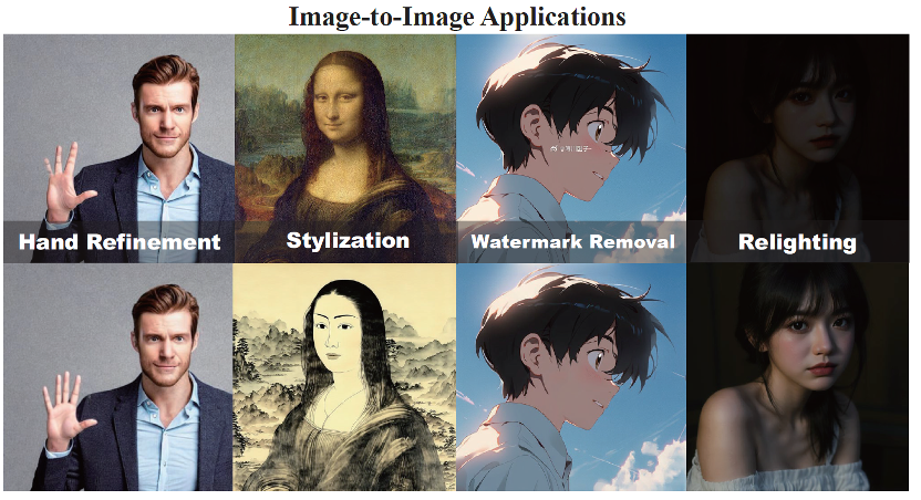 此外,该框架也可以看作是一种新的image-to-image框架,经过特殊数据训练还可用于一些low level任务。作者尝试了未经额外训练模型就可以泛化到一些特殊任务上,如图像光照改变、水印去除、修复等等。