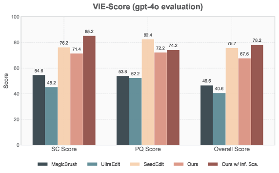 作者测试了采用inference-time scaling策略与直接随机生成的效果,使用基于GPT4o的VIE-score进行测评,更符合人类偏好。可以看到采用该策略后,VIE-score大幅提升,甚至媲美字节豆包图像编辑模型SeedEdit(4月份版本)。
