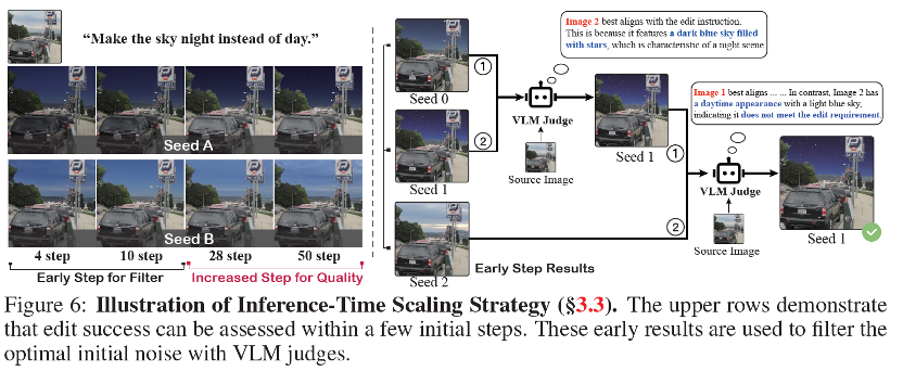 如图所示,案例要求将天空变成黑夜的样子,有的噪声候选在前4步时是天亮的样子,进行完整的50步推理依然是天亮的样子,不满足编辑的要求,因此可以用VLM作为判官在前几步就把这个不符合的候选去除,节省推理的步数耗费。此外,VLM还可以优中取优,即使都完成了天空变成夜晚的操作,但是一个编辑后还有星星在空中闪烁,更符合夜晚的氛围,VLM也能将它认为是更好的结果留下。