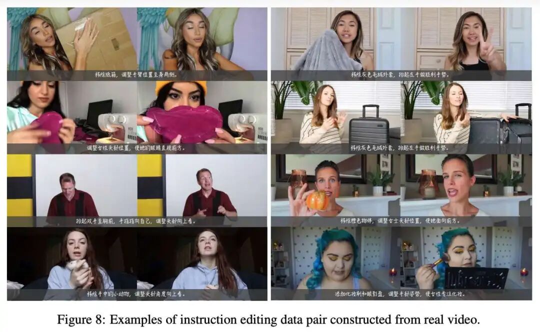 最后,受UniReal的启发,本文扩展了数据集,使用从原始视频中提取的视频集群,以涵盖更多非刚性编辑任务(例如,运动变化、视角转换,如放大和缩小)。代表性数据示例见下图8。
