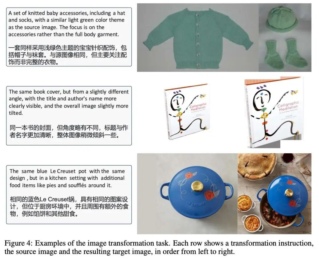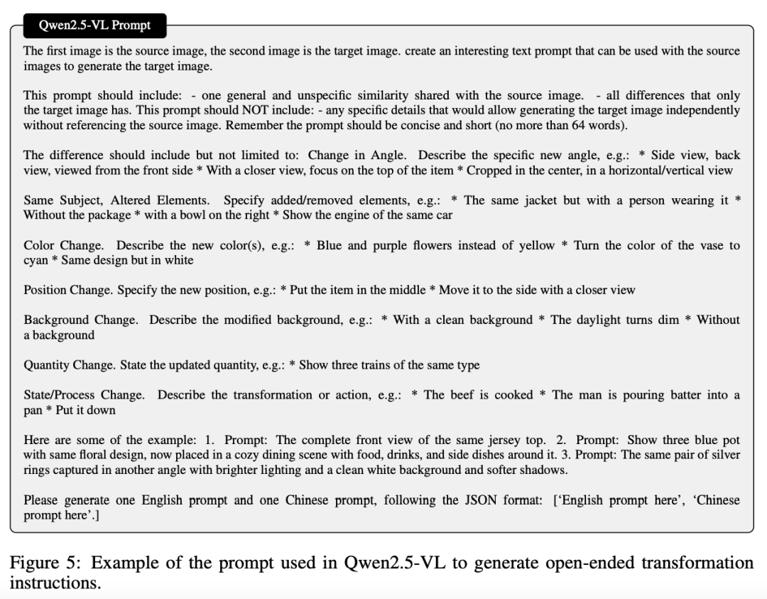 图像转换。 遵循MetaQuery的方法,本文从网络语料库中构建了自然发生的图像对,并利用多模态大语言模型(MLLMs)生成相应的开放式转换指令。具体而言,本文使用SigLIP图像特征对来自MMC4-core、OmniCorpus-CC和OmniCorpus-CW等来源的共享相同说明的图像进行聚类,然后通过相似性阈值过滤这些聚类,获得80万图像转换三元组。如下图4所示,每个三元组包含一个源图像、一个由Qwen2.5-VL生成的开放式转换指令(如下图5所示)和一个目标图像。指令涵盖视角变化(例如,放大/缩小、旋转)、外观修改(例如,颜色/材料替换)和结构调整(例如,添加/移除物体)。