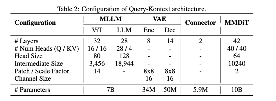 架构。本文从 Qwen2.5-VL-7B 初始化 MLLM,并将连接器实现为一个两层的 MLP。(架构配置的详细信息在下表 2 中提供。)连接器将文本和 kontext token 映射到扩散潜在空间;输出在输入到扩散 transformer 之前进行拼接。此外,本文在阶段 a 中使用轻量级 MMDiT 架构(约 870M 参数)实现扩散头。本文在 Query-kontext 中设置最大参考图像 和 ,即 。本文在扩散模型中设置秩 ,,在 MLLM 的 LoRA 中设置秩 ,。