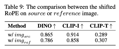 进一步检查了所提出的偏移2D-RoPE机制在处理参考图像时的效果。对于源输入图像,模型倾向于保持输入的像素级保真度,生成忠实的重建。相比之下,对于参考输入图像,模型强调指令遵循和泛化,在保持主体身份的同时生成更为多样化的输出。使用源图像与参考图像在DreamBooth基准上的比较结果如下表9所示。