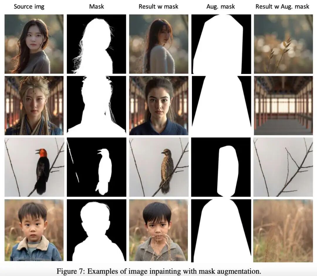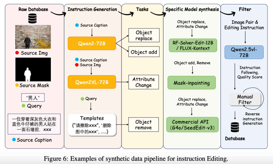 基于现有方法,构建了一个合成数据 Pipeline,专门用于本地中文指令编辑,生成了额外的30万高质量三元组。如下图6所示。给定一个源图像、其分割掩码和一个说明,本文首先提取对象级查询(例如,“人”)并生成多样化的编辑指令。具体而言,大语言模型(Qwen2-72B)从说明中生成文本编辑提示,而多模态模型(Qwen2VL-72B)利用说明和图像生成更细粒度的属性修改指令。此外,本文引入基于模板的指令(例如,“从图像中移除xxx”)来进一步处理对象移除任务。生成的指令被分类为四种任务类型:对象替换、对象添加、对象移除和属性修改。每个任务由专门的合成模型处理:RF-Solver-Edit-12B或FLUX-Kontext用于替换和属性编辑,基于掩码的修复模型用于添加和移除,以及商业API(例如,G4o/SeedEdit-v3)用于更复杂的操作。最后,生成的三元组通过自动评估阶段进行过滤,使用Qwen2.5VL-72B对指令的保真度和图像质量进行评分,然后进行人工验证以确保可靠性。最后,通过将源图像作为目标应用手动反向指令生成,确保来自真实图像的监督而无模型引起的伪影。此外,在应用掩码修复模型移除大型物体时,本文采用掩码增强策略以减轻形状引导掩码的影响。下图7展示了有无掩码增强的结果比较。