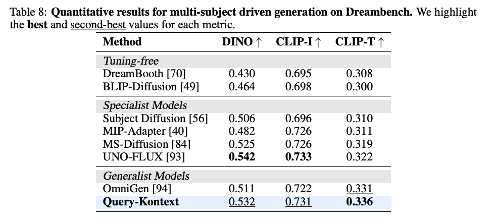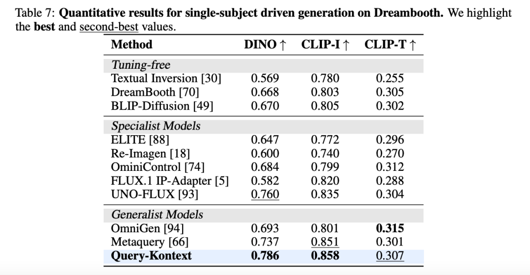 此外,注意到感知质量得分存在一些缺陷,主要是因为缺乏旨在增强生成质量或真实感的强化学习或监督微调阶段。本文将在未来的工作中进行这方面的探索。在DreamBooth上的主体驱动生成中,Query-Kontext以DINO 0.786和CLIP-I 0.858建立了新的最先进结果,显著超过了Metaquery(0.737 / 0.851)和UNO-FLUX(0.760 / 0.835),尽管CLIP-T略低(0.307对比OmniGen的0.315),如下表7所示。在下表8中,Query-Kontext在多主体合成基准DreamBench上取得了最佳CLIP-T得分(0.336),以及具有竞争力的DINO(0.532)和CLIP-I(0.731)结果。