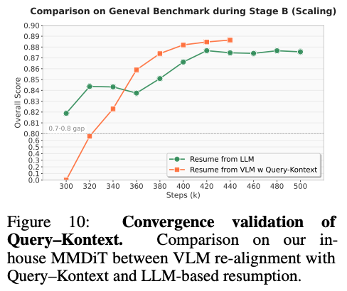 在阶段2中,分析了扩散模型在两种设置下的收敛行为:(i)来自LLM的仅文本嵌入和(ii)来自文本标记和本文微调的VLM生成的Query-Kontext标记的混合条件。观察到,用本文的VLM替换LLM可以更快地使扩散模型对齐,并且与LLM条件基线相比,产生更优越的视觉结果,如下图10所示。这表明,通过Query-Kontext将多模态推理与视觉生成解耦,不仅加速了收敛,还释放了VLM和扩散模型的全部潜力。