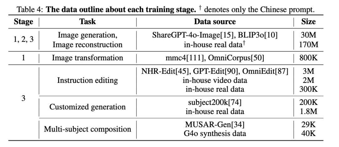 基础设施。在训练期间,本文采用混合并行优化策略。在 VLM 端启用张量并行。对于扩散模型,本文使用参数分片(ZeRO Stage-2)以及 bfloat16(BF16)混合精度训练。为了在小批量内保持序列长度一致,本文根据图像长宽比(支持 1:1, 1:2, 2:3, 3:4, 3:5, 4:5 和 9:16)和参考图像数量维护两个独立的分桶器,以便同一批次中的样本产生相同数量的潜在 token ,减少填充并提高吞吐量。本文构建了一个多模态参考到图像的数据集(如下表 4 所总结),由真实、合成和精心策划的开源数据集混合而成。该数据集涵盖五类任务:文本生成图像、图像转换、指令编辑、定制生成和多主体组合。