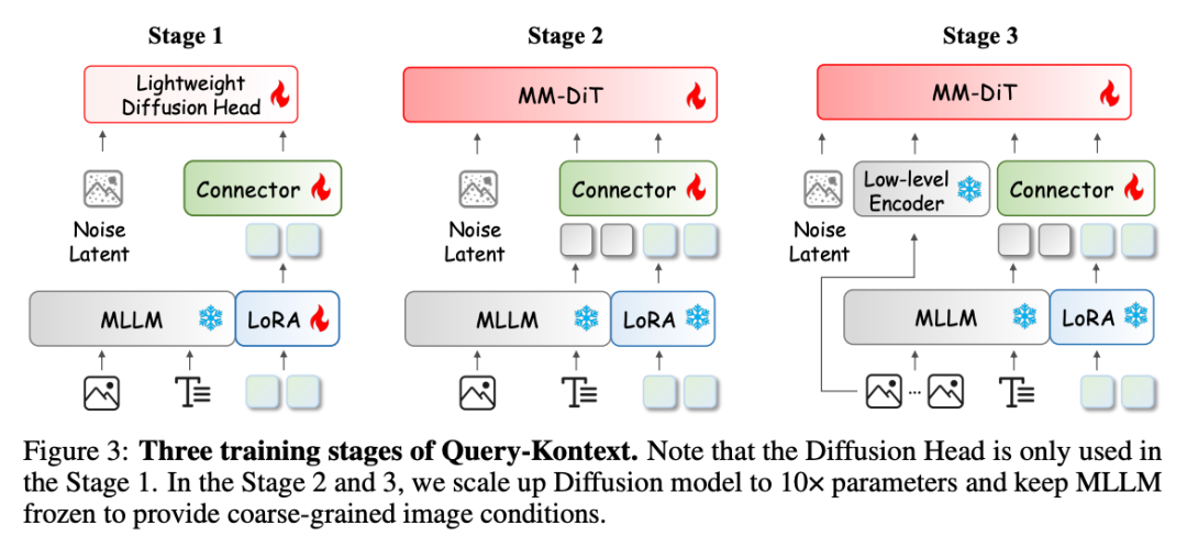 阶段 3:最后,本文引入专用的低级图像编码器用于源或参考图像,以进一步优化扩散模型的高保真图像引用。在阶段 3 中,MLLM 保持完全冻结,本文仅优化 Query-Kontext token 和连接器。此外,本文对扩散模型本身应用基于 LoRA 的微调,以在扩展到本文所有任务的同时保持其高质量图像合成能力。这不仅包括标准的文本生成图像,还包括指令引导的图像编辑、用户定制的图像生成和多主体组合任务。