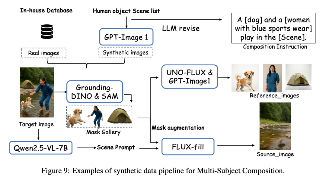 多主体合成。 最后,本文使用开源的MUSAR-Gen数据集和一个新的合成数据 Pipeline 解决多主体图像合成问题。如下图9所示,本文设计了一个合成 Pipeline 来构建高质量的多主体合成数据。从内部数据库开始,本文结合真实和合成图像,并生成由大语言模型进一步优化的人物-物体-场景列表,以产生自然的合成指令。Grounding-DINO和SAM用于提取对象级掩码并构建掩码库,为后续合成提供结构指导。主体和物体的参考图像由UNO-FLUX和GPT-Image1合成,而场景背景由掩码修复模型生成。生成的目标图像与相应的合成指令和场景提示一起,形成多样化的训练三元组,增强了多主体场景的覆盖。这产生了4万个多主体参考示例,每个示例都包含多个人物、物体和复杂场景的合成,从而丰富了数据集对现实多实体交互的覆盖。