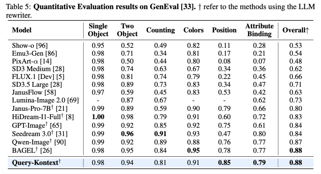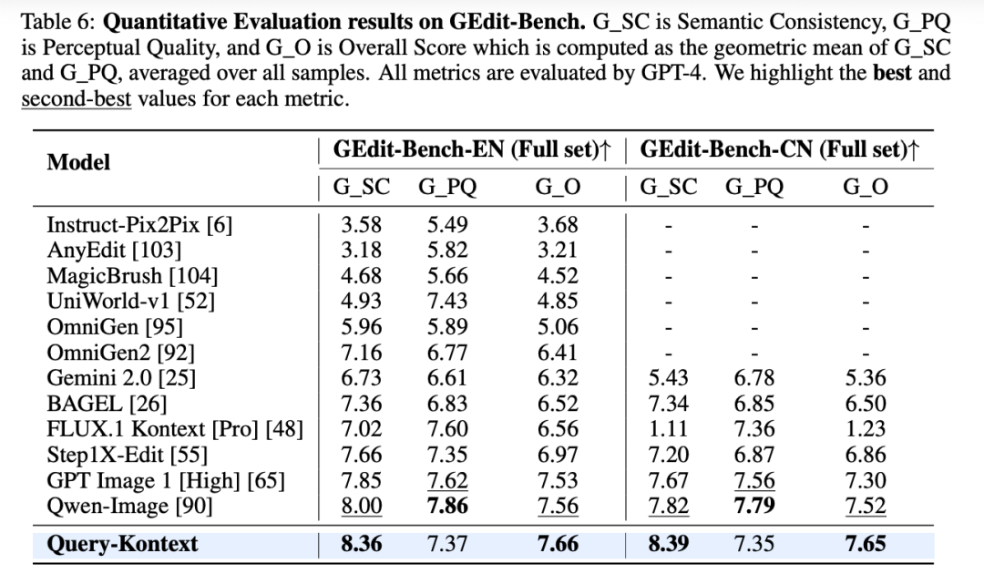 本文在一套全面的基准测试中评估了Query-Kontext,涵盖文本生成图像、指令引导编辑、主体驱动定制和多主体合成。具体而言,本文报告了在GenEval、GEdit-Bench、DreamBooth和DreamBench上的结果。在GenEval上,Query-Kontext取得了0.88的总分,与统一UMM(BAGEL)达到的SOTA结果相匹配,如下表5所示。本文的结果基于由DeepSeek重写的中文提示。在GEdit-Bench上,Query-Kontext在指令引导编辑中取得了最高的整体表现,英文部分得分为7.66,中文部分得分为7.65。这些结果超过了Qwen-Image(7.56 / 7.52)和GPT-Image(7.53 / 7.30),如下表6所示。