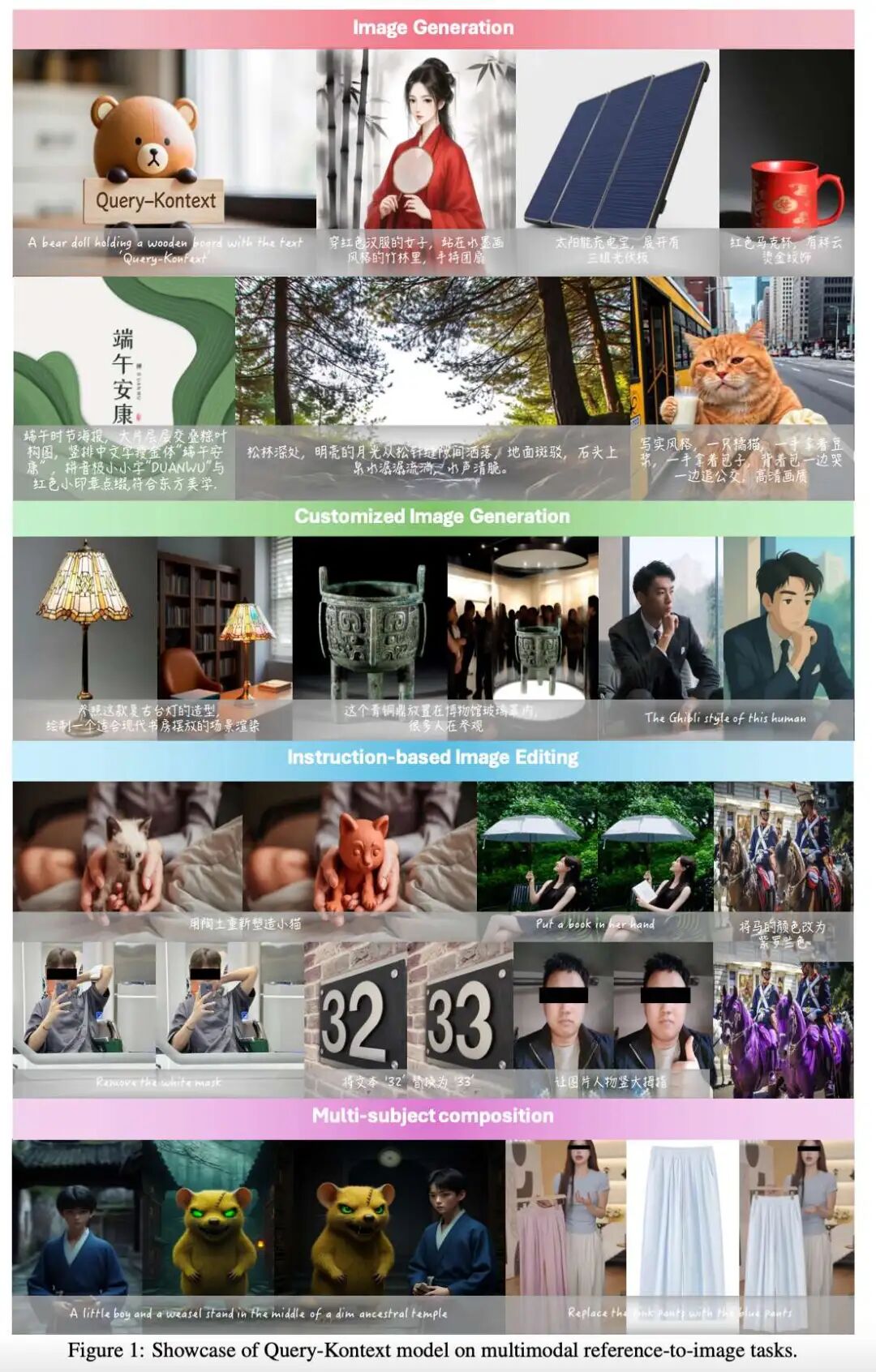 Query-Kontext,一个经济的统一多模态到图像框架,将多模态生成推理(由VLM处理)与高保真渲染(由扩散模型处理)解耦。为了充分利用这两个组件的潜力,本文提出了一种三阶段渐进训练策略,逐步将VLM与日益强大的扩散生成器对齐,同时增强它们的互补优势。此外,本文策划了一个多模态参考到图像的数据集混合,涵盖真实、合成和经过精心筛选的开源数据。大量实验表明,本文的框架在各种任务中实现了有竞争力的性能,包括图像生成、指令编辑、定制主体合成和多主体合成。
