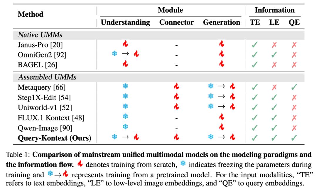 此外,在下表 1 中区分了原生 UMM 和组合 UMM。比较突出了每个模型是从头开始训练、冻结参数还是调整预训练组件,并指定了通过文本嵌入(TE)、低级图像嵌入(LE)和查询嵌入(QE)的信息流动。特别是,查询嵌入自然释放了 VLM 的上下文学习能力,使模型能够对多模态输入进行推理并生成连贯的图像。与之前的方法不同,本文的 Query-Kontext 将查询嵌入与文本和低级图像嵌入集成,同时有效地解耦理解和生成模块,以提高效率和灵活性。