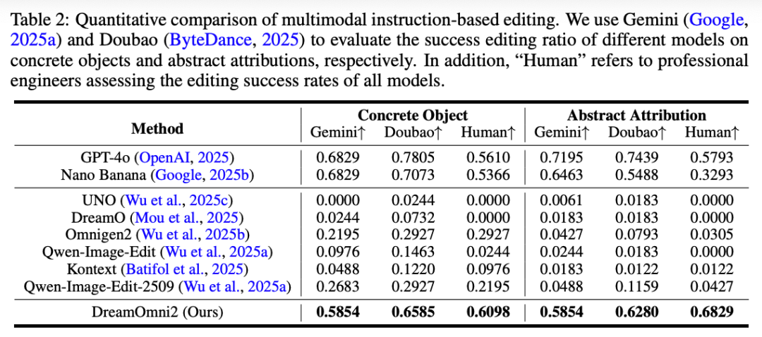 基于多模态指令的图像编辑评估。 如下表 2 所示,本文比较了几种原生支持多图像输入的竞争模型,如 DreamO、Omnigen2和 Qwen-Image-Edit-2509。虽然 Kontext和 Qwen-Image-Edit原生不支持多图像输入,本文应用了 Diffusers的方法,将多张图像合并为一个输入。还比较了闭源的商业模型,如 Nano Banana和 GPT-4o。本文在 DreamOmni2 基准上测试了具体对象和抽象属性的编辑示例。模型的成功率由 Gemini 2.5和 Doubao 1.6评估,并由数位专业工程师手动评估结果。如下表 2 所示,DreamOmni2 在人工评估中表现最佳。在 VLM 测试中,DreamOmni2 显著优于开源模型,并取得了接近商业模型的结果。事实上,GPT-4o 和 Nano Banana 经常在编辑属性中引入意外的变化或不一致,这与参考图像不符。这些问题对于 VLM 来说难以准确检测。此外,GPT-4o 导致编辑后的图像出现泛黄现象。
