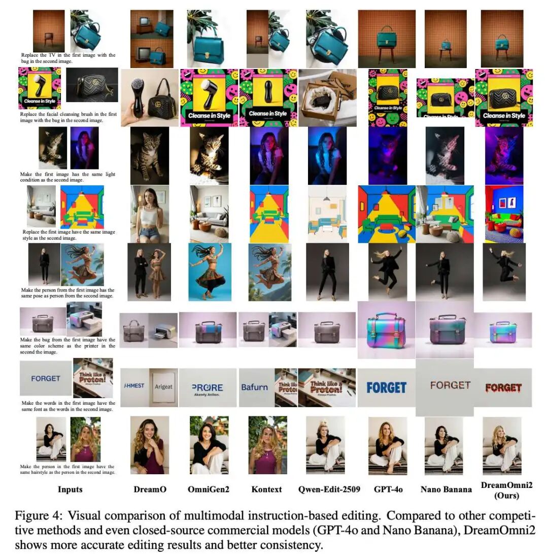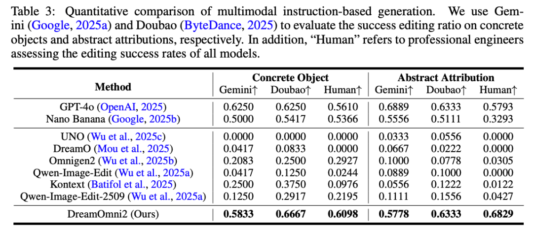 基于多模态指令的图像生成评估。 如下表 3 所示,本文的方法在人工评估和 Doubao 1.6 及 Gemini 2.5 的评估中均优于商业模型 Nano Banana,取得了与 GPT-4o 相当的结果。与主要专注于生成具有多个具体对象图像的开源模型(如 DreamO、Omnigen2 和 Qwen-Edit-2509)相比,DreamOmni2 在生成准确性和对象一致性方面仍显著优于它们,即便在它们的专业领域内也是如此。这进一步强调了 DreamOmni2 在基于多模态指令生成中的有效性。