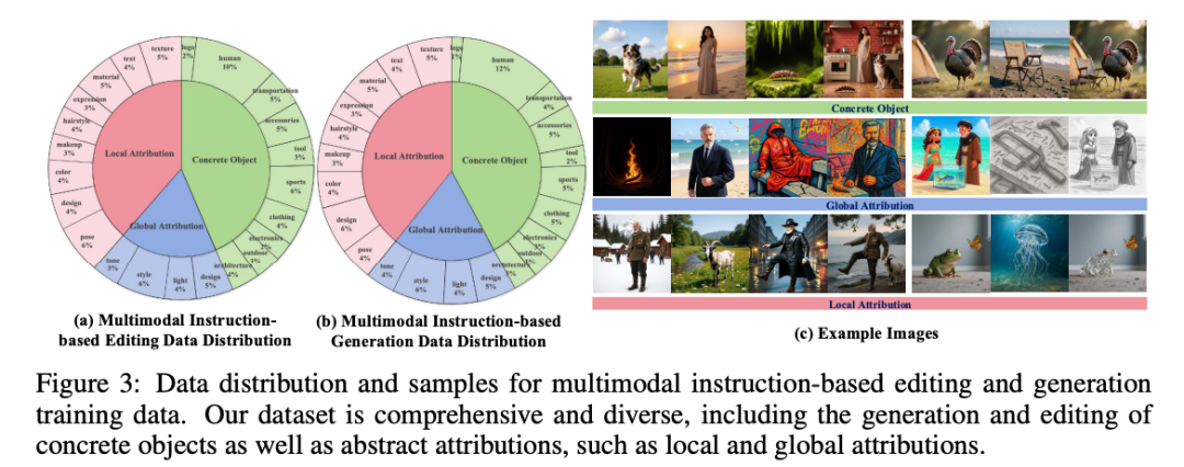 基于多模态指令的编辑和生成是新任务,其主要挑战是缺乏训练数据。对于基于多模态指令的编辑,之前的数据创建流程涉及生成指令、源图像和目标图像的三元组。然而,这种方法无法创建将参考图像作为编辑条件的数据。对于基于多模态指令的生成,之前的主体生成数据流程依赖于分割检测模型来创建参考图像。这种方法难以合成用于生成参考抽象属性或被遮挡的具体物体的数据。