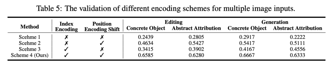 索引和位置编码。 如下表 5 所示,比较了不同的编码方案以帮助模型适应多图像输入。比较方案 3 和方案 1,本文发现添加索引编码使模型能够理解用户指令中“图像 1”、“图像 2”和“图像 3”等引用对应的是哪个图像,从而生成和编辑更准确。此外,比较方案 3 和方案 4,观察到在包含索引编码的情况下,多张图像需要位置编码偏移,而不是使用相同的位置编码。这种调整防止了复制粘贴效应,提高了模型的编辑和生成性能。因此,在 DreamOmni2 中,本文结合索引编码和位置编码偏移来处理多个参考图像。