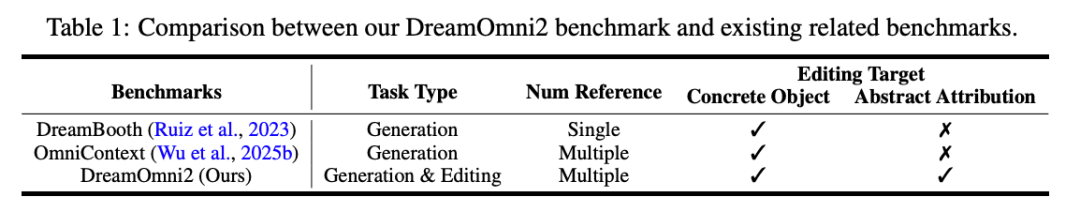 目前,还没有针对多模态指令编辑和生成的基准。如下表1所示,DreamBooth仅支持单图像生成。虽然 OmniContext包含一些多参考测试案例,但它仅专注于具体对象组合,并未评估基于多模态指令的编辑或抽象属性的加入。为了解决这个问题,提出了 DreamOmni2 基准,以推动这些领域的进展。本文的基准是全面的,由真实图像组成,以准确评估模型在现实场景中的表现。测试案例涵盖了各种类别,包括抽象属性(全局和局部)和具体对象的参考生成和编辑。更多关于 DreamOmni2 基准的信息可以在附录中找到。