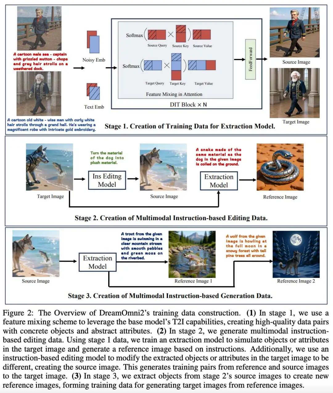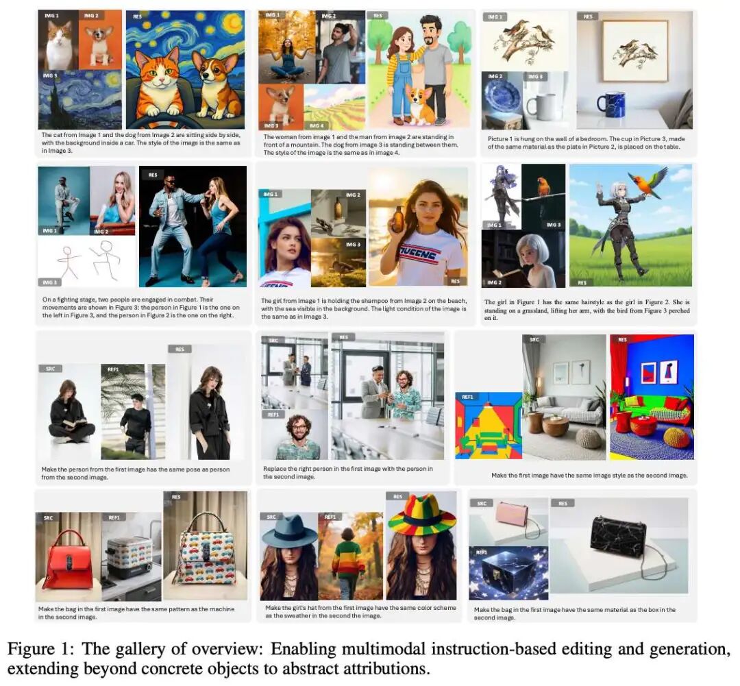 之后,如上图2的第三阶段所示,创建基于多模态指令的生成数据。使用提取模型从第二阶段的源图像中提取关键词,生成参考图像。通过将这些与第二阶段的参考图像结合,可以获得由多个参考图像、一个指令和一个目标图像组成的训练元组。