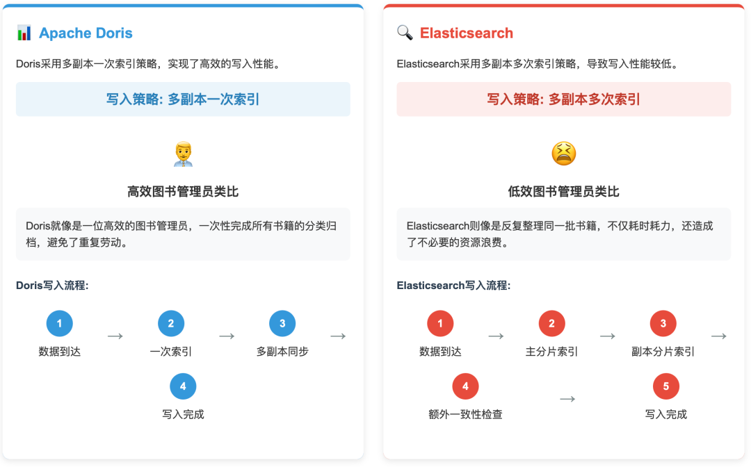 Doris采用的多副本一次索引策略,就像是一位高效的图书管理员,一次性完成所有书籍的分类归档。而Elasticsearch的多副本多次索引,则像是反复整理同一批书籍,不仅耗时耗力,还造成了不必要的资源浪费。