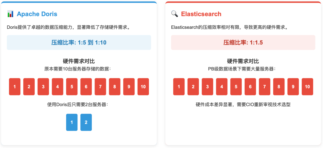 好比原本需要10台服务器存储的数据,现在只需要2台就能搞定,这种成本节约在数据量呈指数级增长的今天显得尤为珍贵。而Elasticsearch 1:1.5的压缩率,在PB级数据场景下,硬件成本的差异足以让任何CIO重新审视技术选型。