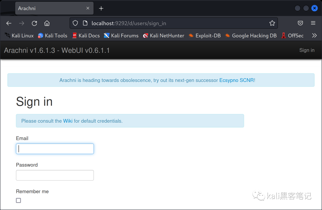 解压文件,然后进入arachni目录下的bin文件夹,运行./arachni_web启动。随后浏览器访问http://localhost:9292