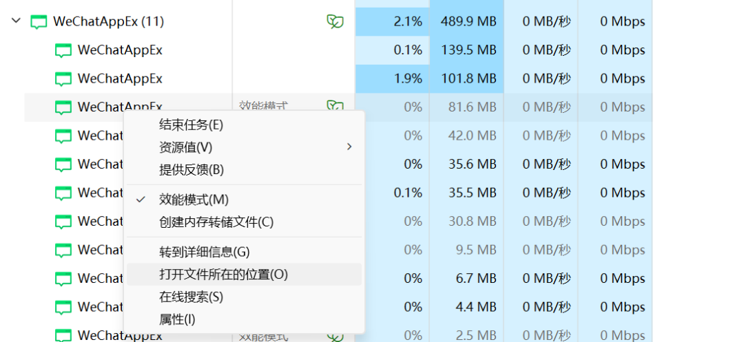 打开微信小程序后,在任务管理器里面找到 WeChatAppEx ,随便选一个点进去,右键打开文件位置。
