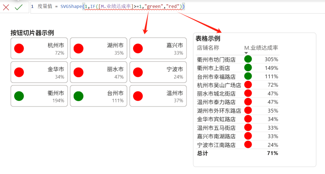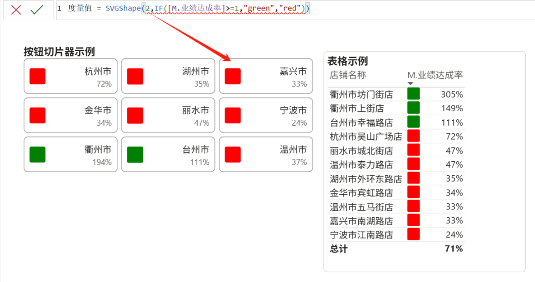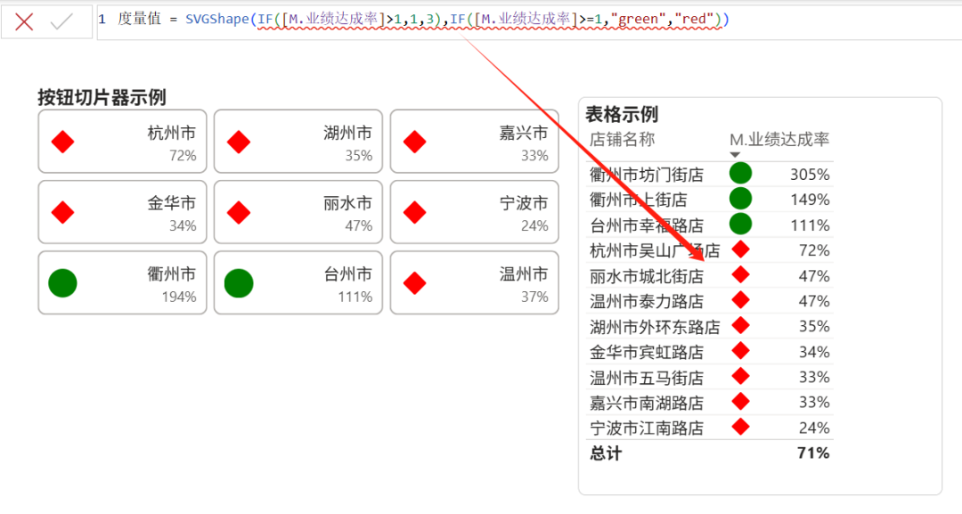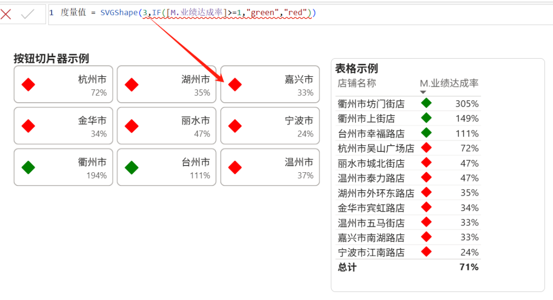 把该度量值放入按钮切片器的图像或者表格矩阵的条件格式图标,即可得到上图效果。