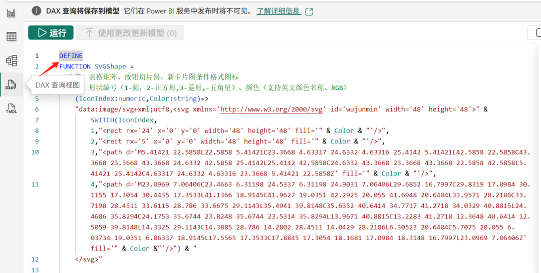 模型中新建名为SVGShape的自定义函数,度量值引用该函数,函数包含两个参数,形状编号和颜色。